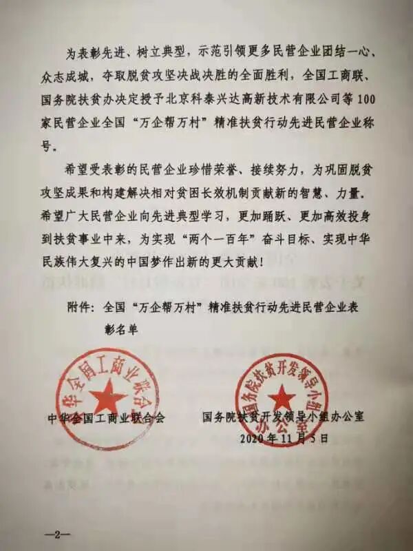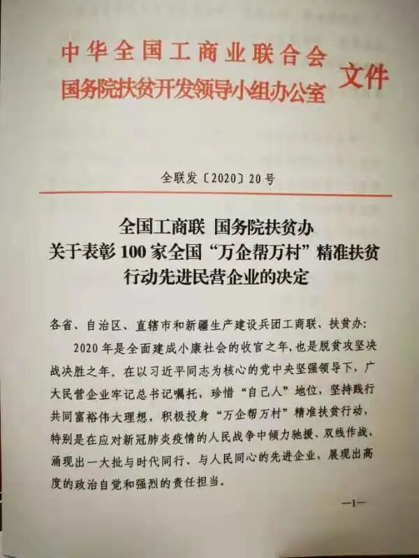 發(fā)布時(shí)間:2020/11/13日前,全國(guó)工商聯、國(guó)務院扶貧辦授予全國(guó)100家民營企業“萬企幫萬村”精準扶貧行動先進(jìn)民營企業稱号,我司榜上有名。
